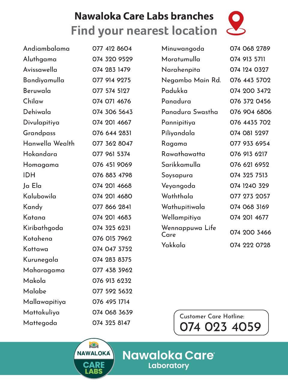 Nawaloka Care Laboratories, Corporate Office, No. 64, Green Path, Colombo 03, Sri Lanka.Contact Us: